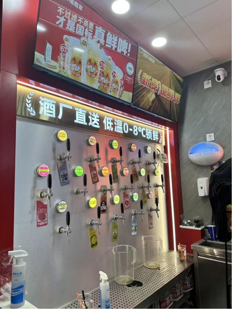 打酒区上方,“酒厂直送,低温0-8℃锁鲜”的标语醒目。店主介绍,店内所有鲜啤均由总部工厂冷链直配,保质期仅一个月,卖不完会直接销毁。