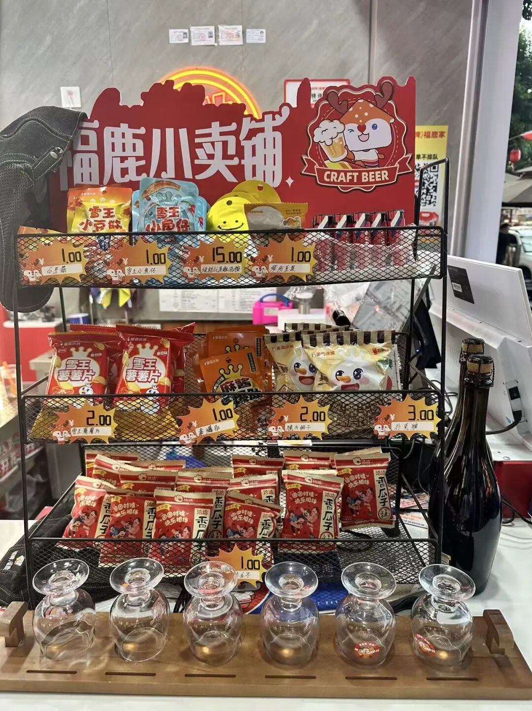 目前,该店鲜打啤酒SKU约16个,包括提供了国标鲜啤、茶啤、奶啤、果啤四大系列。此外,还有福鹿家罐装啤酒,以及解酒糖、扑克牌和“雪王小豆筋”“雪王薯片”“雪王小鱼仔”、恰恰香瓜子等十余款小食,价格在1-15元之间。