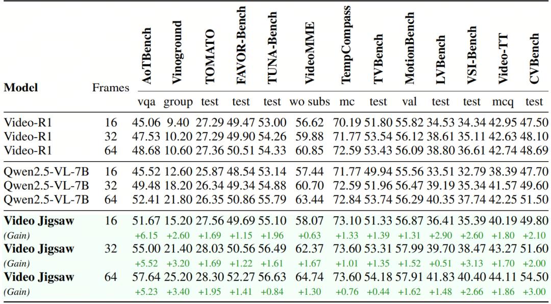 经过video jigsaw 的训练,模型在各类通用视频理解基准上均表现出稳定的提升。该方法整体上增强了模型对视频的感知与理解,并且在需要时间维度推理和时间方向性理解的任务(如 AoTBench)上提升尤为显著。