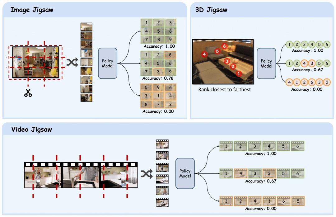 它将经典的自监督拼图任务重新设计为多模态大模型后训练阶段的核心目标,让模型在不依赖额外标注、也无需视觉生成模块的情况下,显式强化自身的视觉感知与理解能力。在图片,视频,和3D三种视觉模态下都验证了其有效性。