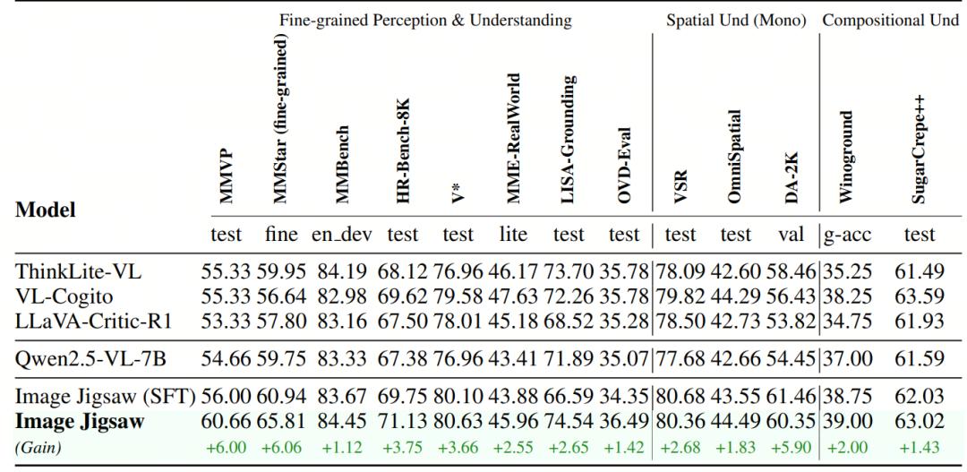 结果表明,在多模态大模型中引入image jigsaw的后训练,能显著增强其感知能力和细粒度视觉理解能力,而这恰恰是现有以推理为主的后训练策略所欠缺的。