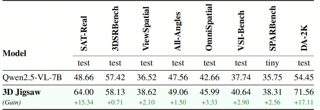 经过3D Jigsaw的训练,模型在各类3D基准任务上都取得了显著提升。最突出的提升出现在与深度估计直接相关的 DA-2K 上,这是深度排序预训练任务的直接体现。但更重要的是,在广泛的其他任务上也观察到了一致的提升,包括单视角基准(如 3DSRBench、OmniSpatial)、多视角基准(如 ViewSpatial、All-Angles),以及第一人称视频基准(如 VSI-Bench)。这些结果表明,该方法不仅让模型掌握了深度排序这一特定技能,同时也有效增强了其整体的三维空间感知与推理能力。
