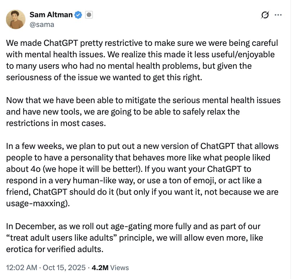 今天凌晨,OpenAI CEO奥特曼发文,宣布ChatGPT将在未来几周推出新版本,并计划在今年12月推出更加全面的年龄分级系统,允许为成年用户提供成人内容。