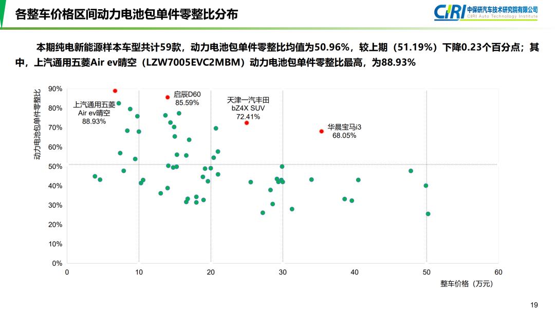 去年,中保研统计了市面上59款主流纯电车型,动力电池包价格平均占到整车价格的50.96%,甚至有车型占比到了88.93%,也就是说这车换电池的费用,基本等于换车了。