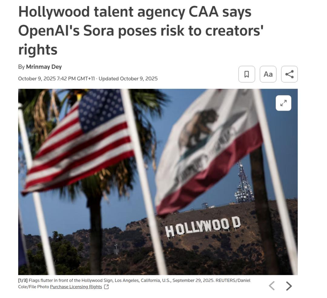10月8日,好莱坞四大顶级经纪公司——CAA(创意艺术家经纪公司)、WME(威廉・莫里斯奋进)、UTA(联合人才经纪公司)以及ICM Partners(国际创新管理公司)——联合发布声明,要求 OpenAI 立即停止 Sora的版权侵权行为。