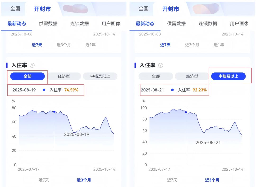 这种结构性悖论直接体现在今年国庆,开封酒店平均入住率降至约60%,虽同比提升30%~40%,但较暑期峰值已明显下滑。