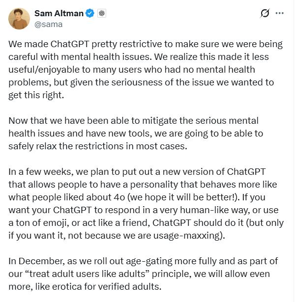 但奥特曼在社交媒体X上发文称,随着公司推出新的技术工具,并已能够有效控制“严重的心理健康风险”,现在已可以“稳妥地放宽”绝大多数内容限制。