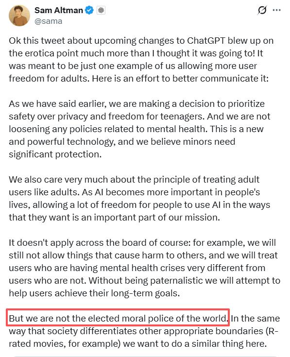 他在社交媒体上进一步上解释这一政策,强调OpenAI“高度重视将成年用户视为成年人的原则”,但同时承诺,仍会禁止“任何对他人造成伤害的内容”。