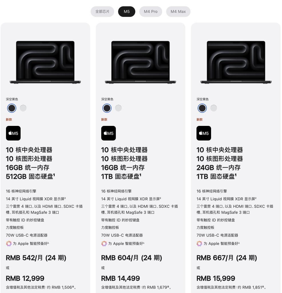 相比上一代,M5系列14英寸MacBook Pro外观变化不大,仍为12999元起。本次更新的亮点是搭载M5系列芯片、比上代提升3.5倍的AI性能、迄今最长的24小时Mac续航、亮眼迷人的Liquid Glass设计等。(M5详情可查看《苹果M5芯片登场:10核CPU、10核GPU,AI性能飙到3.5倍》)