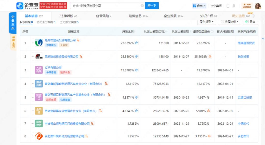 当年2月,实控人为王来春、王来胜的立讯精密发布公告,披露控股股东立讯有限以100.54亿元的代价,从青岛五道口手中收购奇瑞控股19.88%股权、奇瑞汽车7.87%股权及奇瑞新能源6.24%股权。