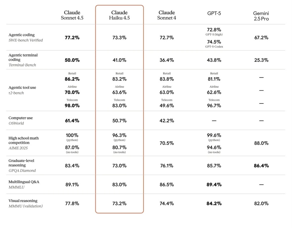 从测试数据来看,Claude Haiku 4.5表现亮眼: