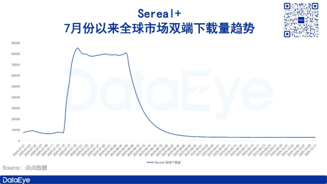 点点数据显示,今年下半年至今,7月中下旬Sereal+全球市场双端日预估下载量多保持在8万次左右,自8月上旬开始大幅下滑,至今,日下载量仅为3000次左右。