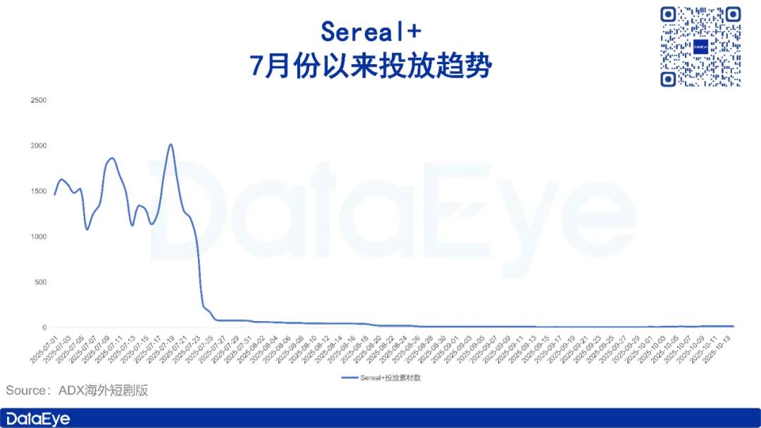 ADX海外短剧版数据显示,今年下半年至今,7月下旬之前,Sereal+始终保持日均1500组左右的投放素材量,7月下旬起投放力度大跌,日投放素材量仅剩几十组,8月底至今,日投放素材量仅为个位数,可判断为基本停止投放。