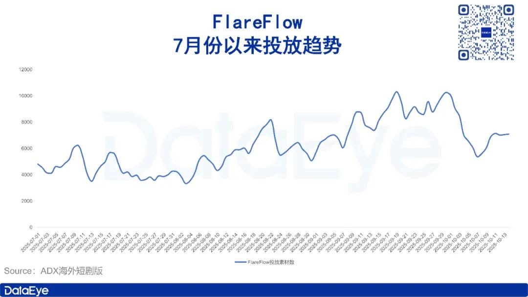 投放力度方面,ADX行业版数据显示,今年7月份至今,FlareFlow投放力度呈持续上涨趋势,日投放素材量由7月初的5000组左右,上涨至10月初的1万组左右,近期稍有回落。