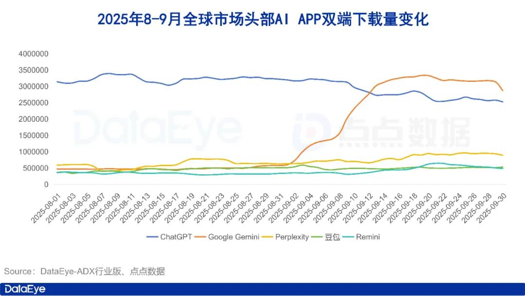 点点数据显示,2025年8月至9月,全球市场头部AI APP双端预估下载量,ChatGPT依旧遥遥领先,但Google Gemini自9月起日下载量迅速上升,与ChatGPT同为第一梯队。