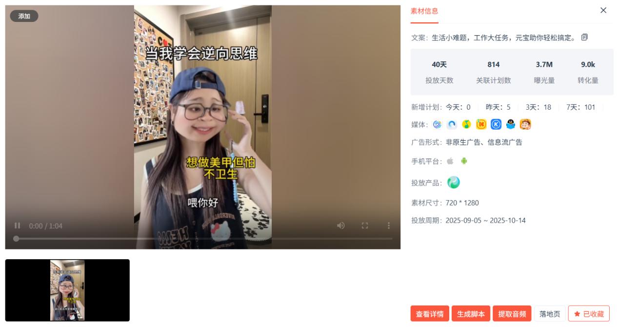 本条素材是腾讯元宝在2025年9月份的新增高曝光视频素材,曝光量370万,转化量9千。