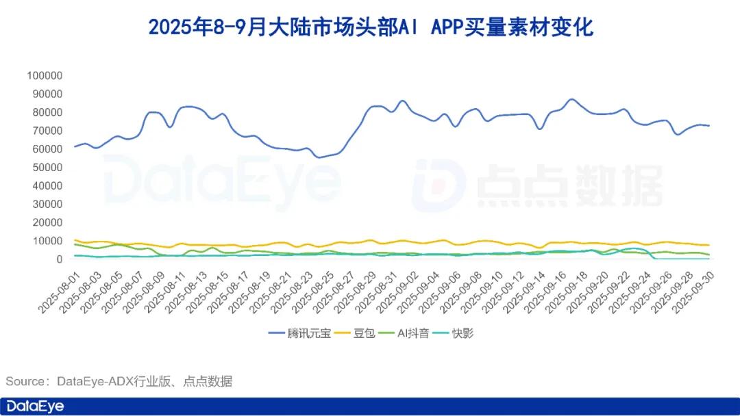 ADX行业版数据显示,2025年9月,大陆市场头部AI APP买量素材呈现出一家独大格局,腾讯元宝以日均8万组左右素材量一骑绝尘,遥遥领先于同类产品,豆包、AI抖音和快影日投放素材量大多在1万组以下。