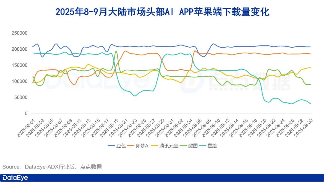 点点数据显示,2025年8月至9月,大陆市场苹果端头部AI APP预估下载量豆包依旧保持领先,即梦AI与豆包的差距进一步缩小。