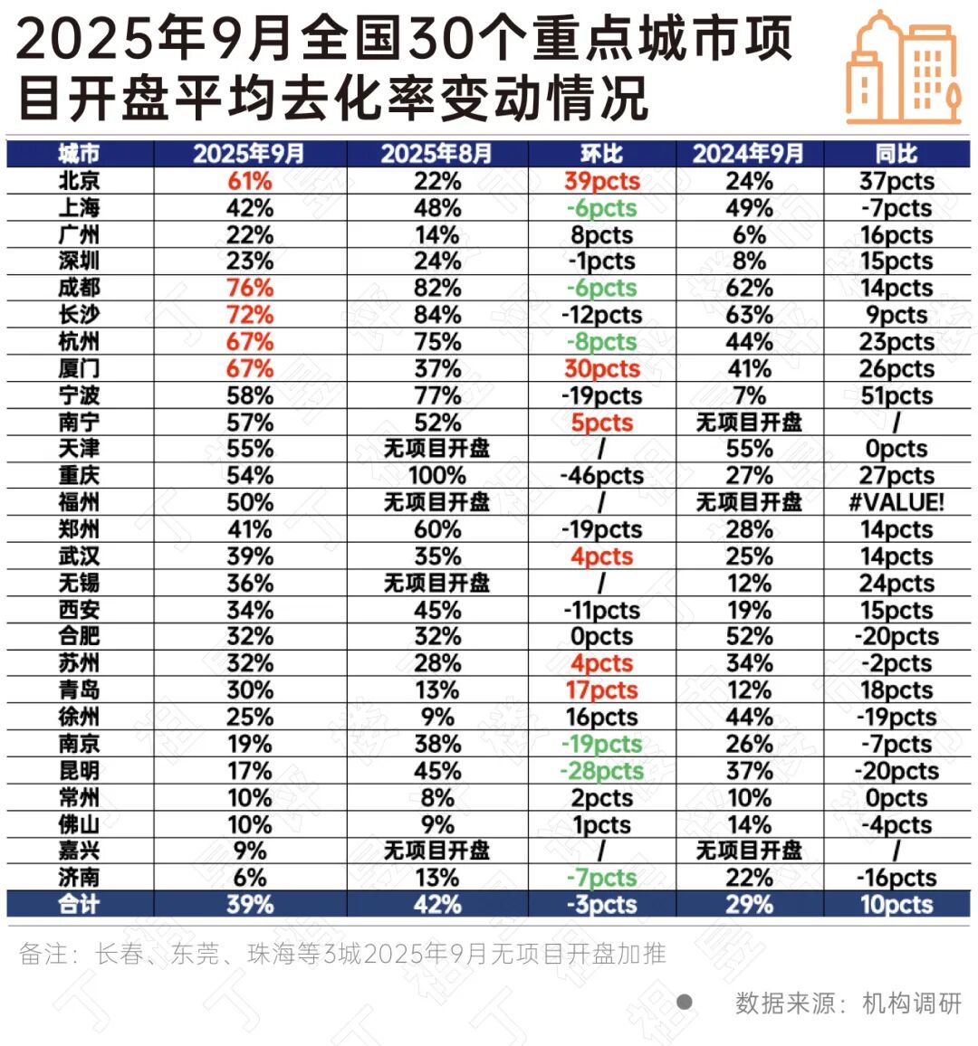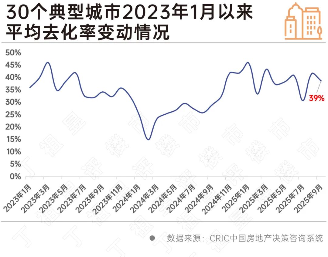 CRIC监测数据显示,9月市场热度高位持稳。从30个典型城市2023年1月以来平均去化率变动情况来看,2025年9月从8月的42%小幅回落至39%,但仍高于去年同期。