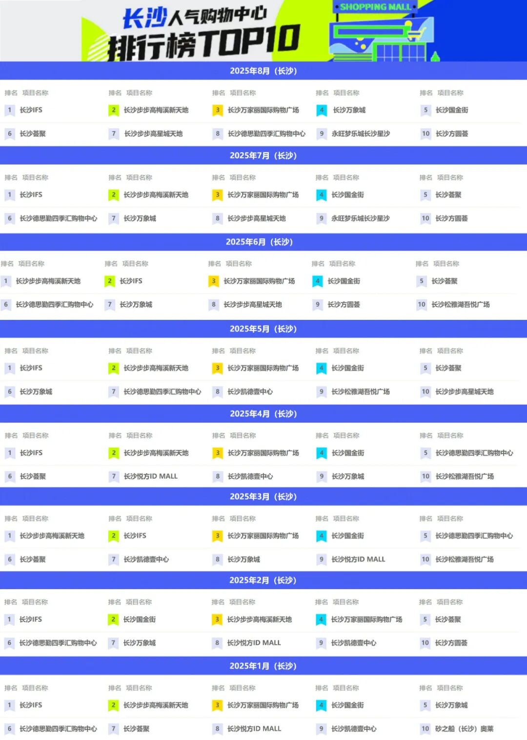 赢商股份2025年1-9月每月更新的《长沙人气购物中心排行榜TOP10》,用动态变化的名单,生动勾勒出长沙商业的活力图景——既有常年稳居前列的“常客”,也有轮番上榜的“黑马”,共同撑起长沙商业的热度。