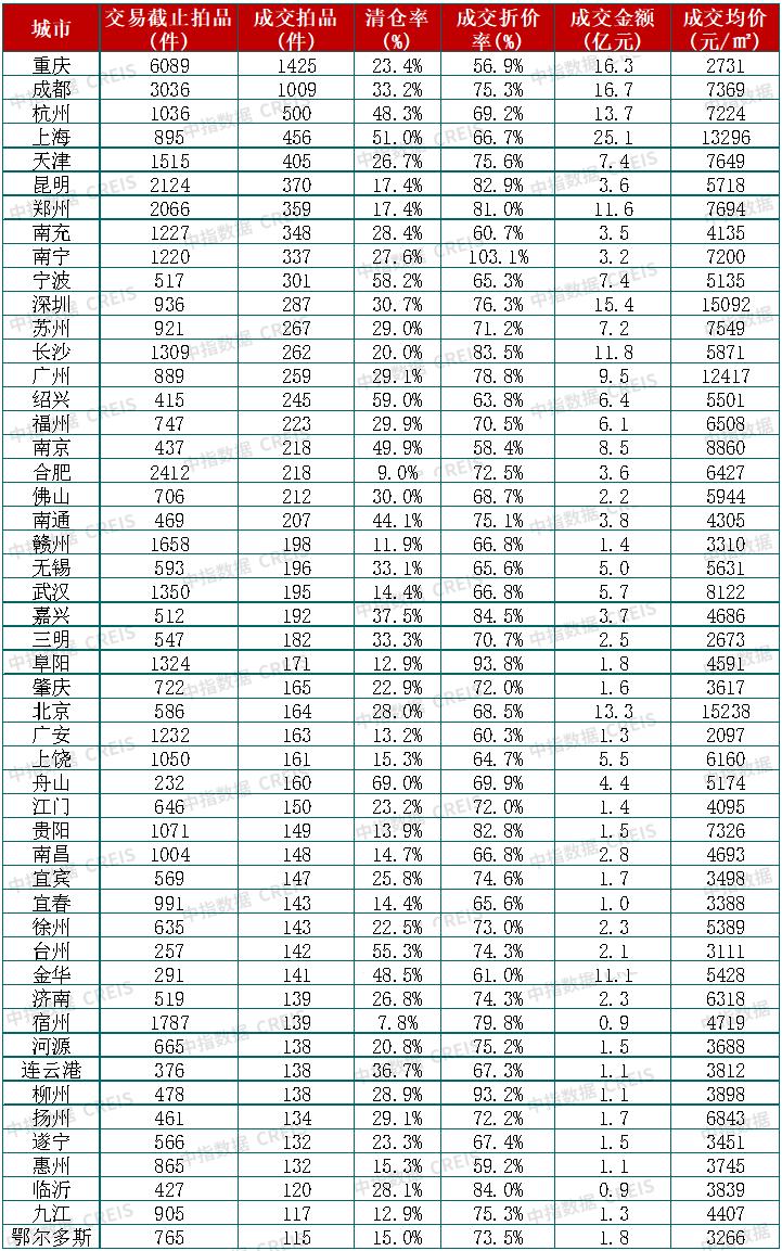 前三季度,成交量TOP50城市成交折价率平均为70.0%,其中南宁成交折价率最高,为103.1%,成交均价7200元/㎡;阜阳挂拍商业法拍成交1324套,清仓率12.9%,成交折价率93.8%排第二,成交均价4591元/㎡。柳州成交折价率93.2%全国第三,成交均价3898元/㎡,挂牌商业拍品478套,成交138套,清仓率28.9%。