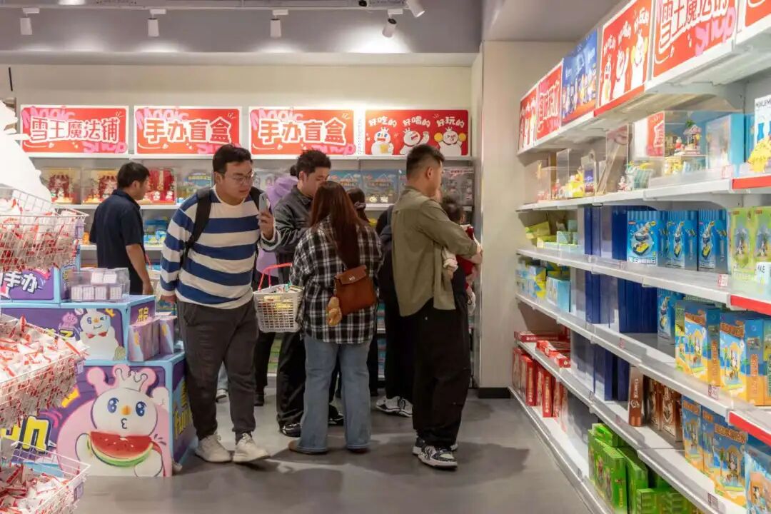 如果说一楼是味道让人上头的“雪王堡垒”,二楼的“雪王周边谷子店”则是让年轻人心甘情愿“氪金”的新宝岛。不论是均价3元/份的联名小零食、7.9元/个的拉霸机玩具、9.9元/套的玩偶,还是25元/个的雪王盲盒、89.9元/套的上市纪念套装,几乎都不愁销路。进店的年轻人一边忙着挑选,一边用手机打卡拍照、拍Vlog素材。如此浓厚的购买氛围,让人很难控制得住剁手的欲望。