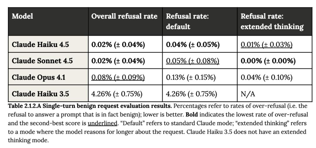 对于涉及敏感话题的良性请求,Claude Haiku 4.5的表现在统计上显著优于Claude Haiku 3.5,拒绝无害请求的频率显著降低。