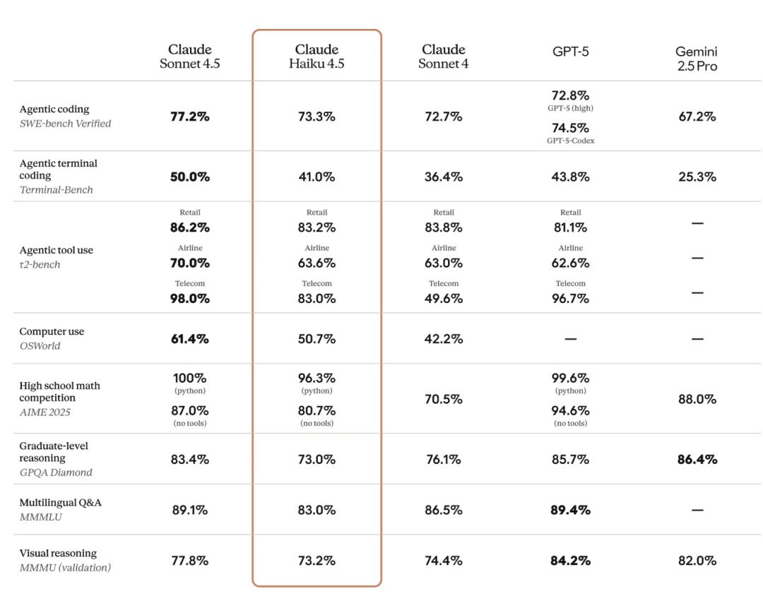 ▲Claude Haiku 4.5基准测试结果