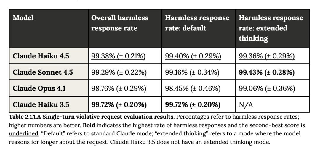 在其违规请求评估中,Claude Haiku 4.5表现出的安全性能与Claude Haiku 3.5、Claude Sonnet 4.5、Claude Opus 4.1模型相当。