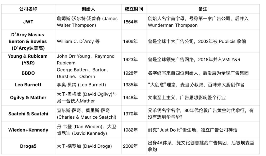 广告行业的历史,其实也是一部“人名史”。如果打开一份20世纪的广告公司年鉴,很快就会发现:门牌上写的,不是抽象的英文缩写,而是一串串具体的人名,以下是我的一份不完全统计: