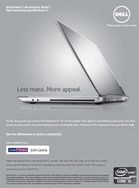 戴尔的广告则更绝。2011年,戴尔在英国报纸上宣扬其XPS-15笔记本电脑是“地球上最薄的15英寸PC”。然而,最下面的小字却表明,这是与宏碁、华硕、惠普、联想、微星、三星、索尼和东芝等品牌的机型进行比较。“并未与苹果或其他未列出的制造商进行比较”。