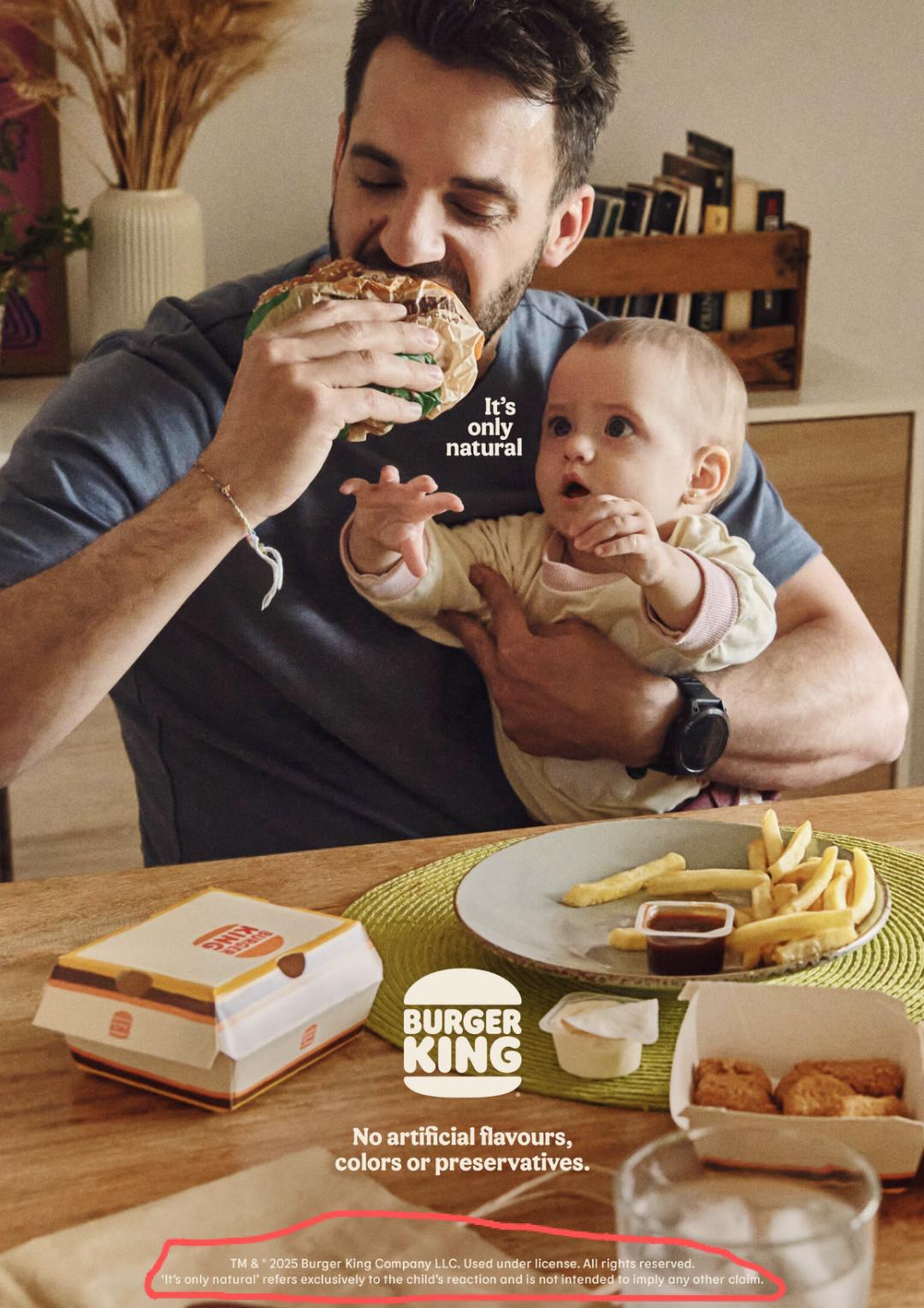 然而,当人们将视线移到海报最底部的角落,一行几乎难以辨认的小字才揭示了谜底:所谓的自然,并非指汉堡食材的天然,而仅仅是婴儿渴望食物的自然反应。人们瞬间觉得被耍了。