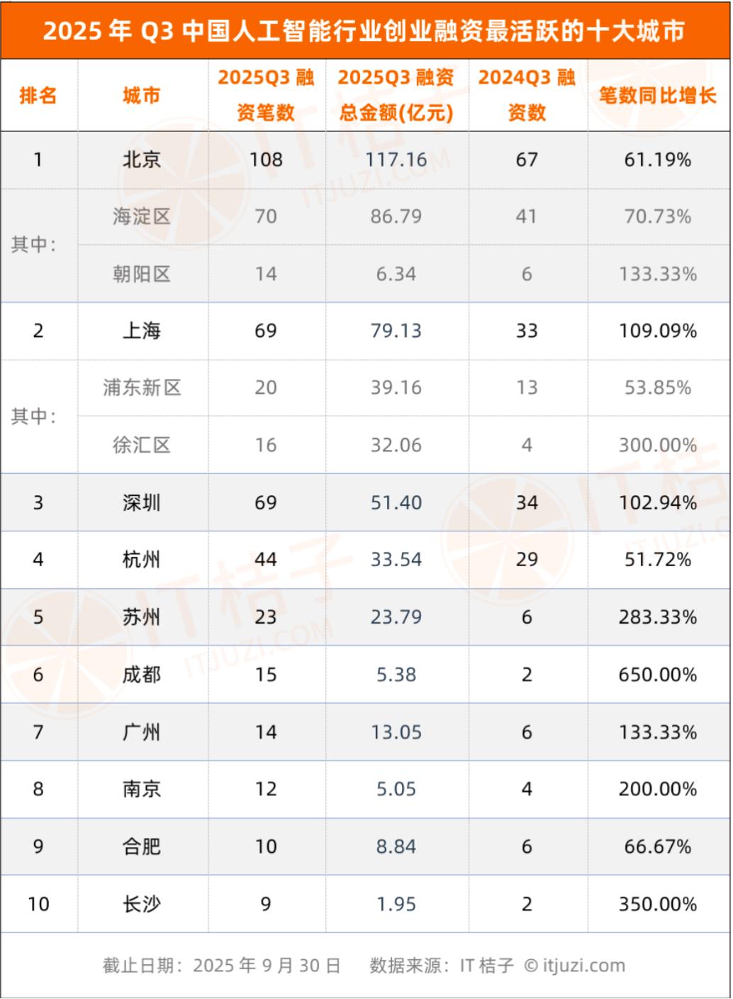 三季度AI融资数同比增近100%;长三角城市群增速显著;长沙竟挤进全国前十
