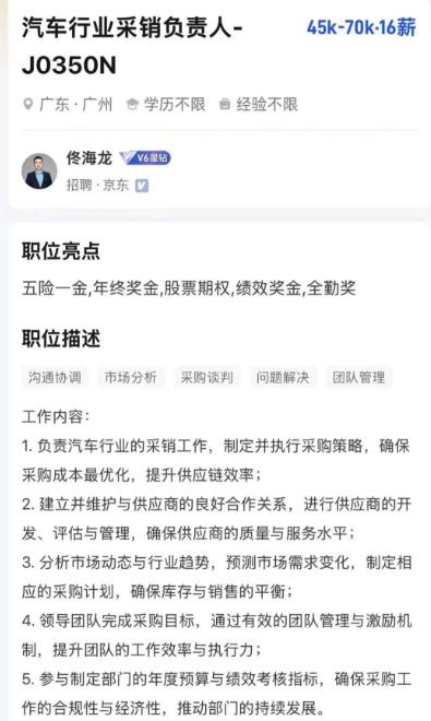 汽车行业采销负责人年薪超过110万元(45k—70k*16薪),需要具备5—10年相关经验,熟悉汽车零部件采购流程及供应链管理。