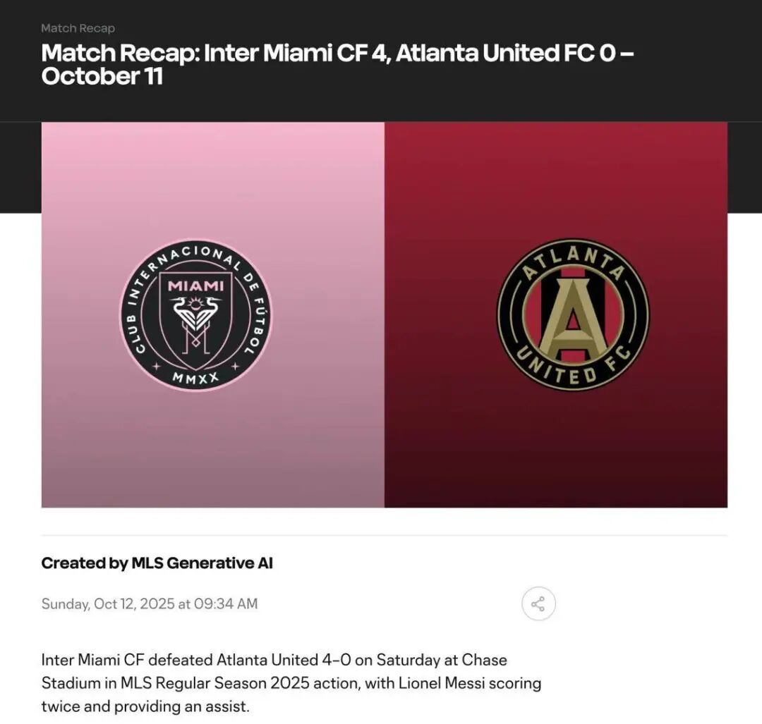 战报末尾注明“AI生成,未经编辑人员审核”,并附上反馈链接 图源:MLS官网截图