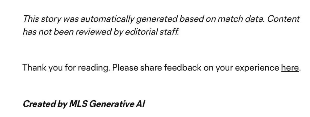 尽管正如美联社的立场所言,“AI写作可以解放记者,让他们执行更有意义的工作”,然而美联社并没有大胆到放弃人的监督。MLS则不然,直接用强调性斜体告知读者,文章“未经编辑人员审阅”。文章则以“MLS生成式AI”来签名。