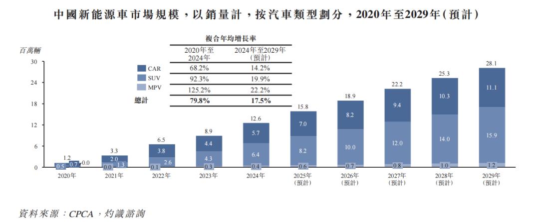 据岚图招股书披露,2024年,全国MPV车型销量仅为40万辆,占全部类型车辆的比重为3.4%。即便是到了2029年,预计MPV销量也仅增长至120万辆,占比上升至4.1%。