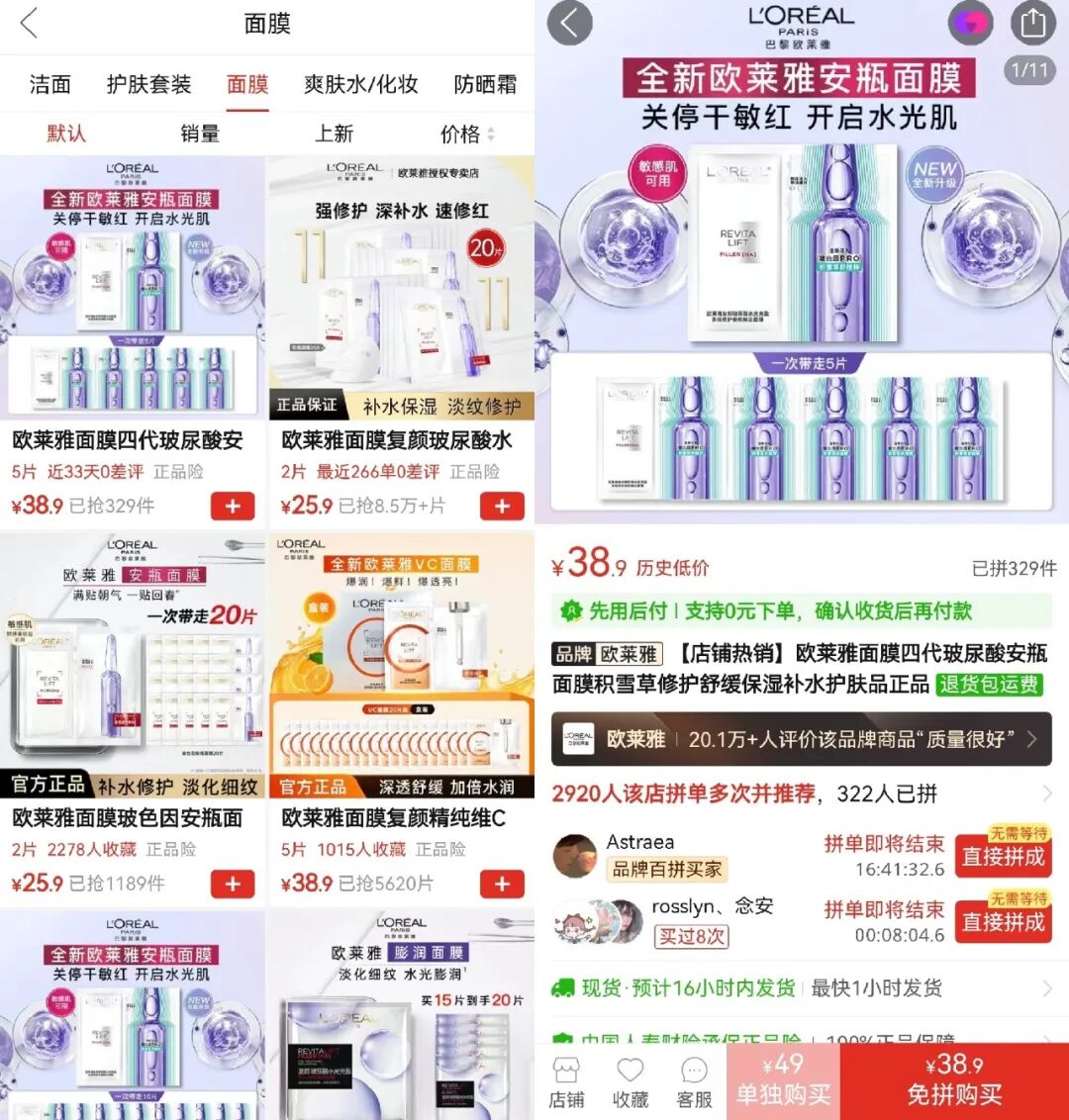 按升囤、按升卖、按百瓶清货的场面屡见不鲜。但消费者却对这种堪比直销商的大促模式感到疲惫,有不少网友表示“真的不想和别人拼单,也没人拼单。”更有网友转身投入拼多多的怀抱,以上述欧莱雅面膜为例,拼多多10张一组的套组中,虽然单片均价略高于李佳琦几毛钱,但胜在可以个性化选择。