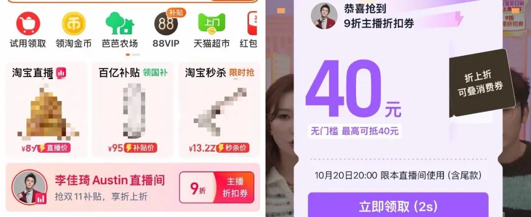淘宝直播同样也对李佳琦予以众望,据壹娱观察(ID:yiyuguancha)发现,10月14日,也就是淘天双11预售的前一天,淘宝App居中的位置就是李佳琦直播间的跳转banner,点击进入即 可领取红包,可用于抵扣直播间定金。