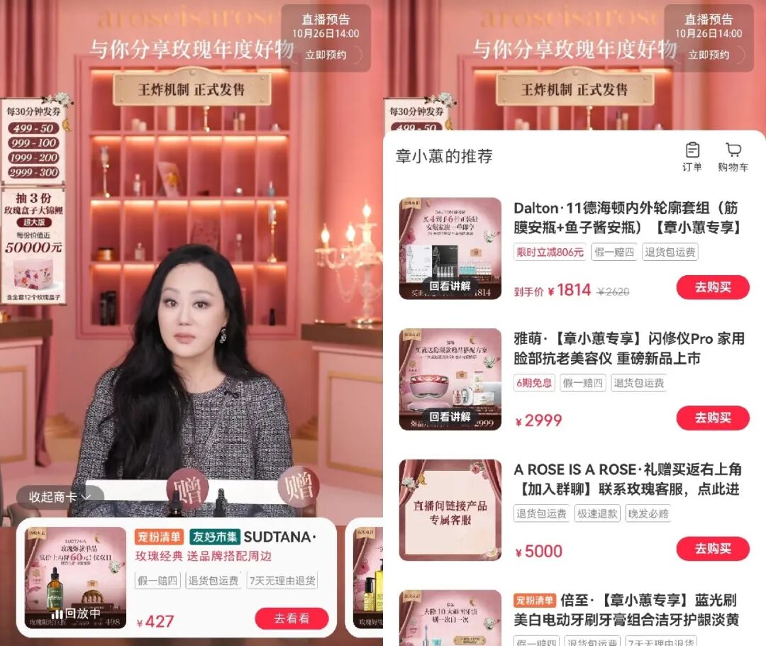 另一边的小红书,即便佛性如章小蕙,其小红书账号也罕见地在10月开播了7场,其中前6场都是为10月12日的双11带货预热介绍的助播场,并且在10月26日还将有一场直播预告。对比去年10月,章小蕙的小红书账号仅开播2场,光是今年10月的直播场次就翻了4倍。