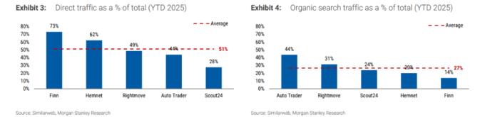 其二,更实质性的风险在于,AI开始蚕食平台的“直接访问”流量。即用户不再直接打开Rightmove或Auto Trader的App,而是转向AI助手了。数据显示,领先的分类信息平台约50%的流量为直接访问,30%来自自然搜索。如果ChatGPT开始蚕食最具价值的直接访问流量,将严重削弱平台的品牌粘性。