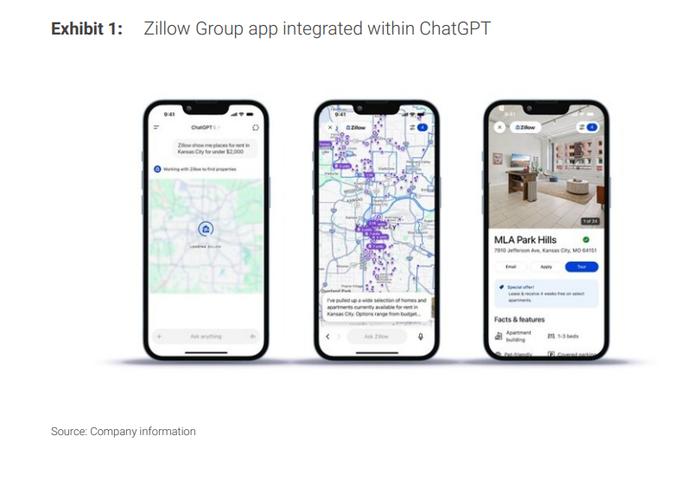 这一判断的最新催化剂是OpenAI近期推出的ChatGPT Apps功能。据报告,该功能允许外部公司将其自身数据和工具直接整合进ChatGPT。此前,AI仅提供宽泛建议或外部链接,而现在,用户可以在聊天界面内直接浏览和筛选实时信息,例如通过Zillow插件搜索房源。