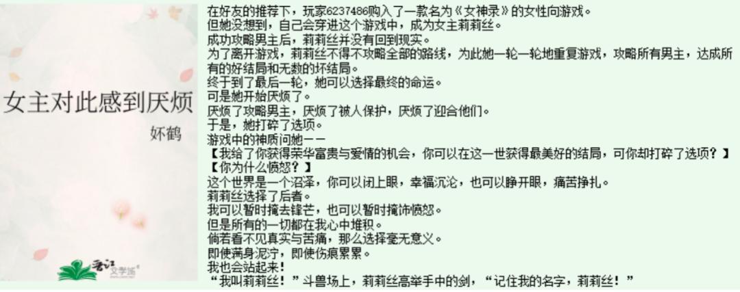 目前公认的“爱女文学”两大名著均出自老牌网文平台:晋江的《女主对此感到厌烦》(作者妚鹤)与起点女生网的《为什么它永无止境》(作者柯遥42)。