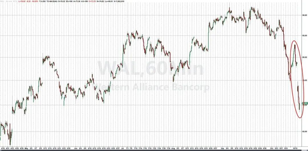 其中,美国区域性银行Zions Bancorp股价单日暴跌了13%,此前该银行披露其加利福尼亚分部的两笔贷款出现意外亏损,这加剧了投资者对隐藏的信贷压力的不安。另一家同类银行也Western Alliance下跌了10.8%,此前该公司称已对一名借款人提起欺诈诉讼。