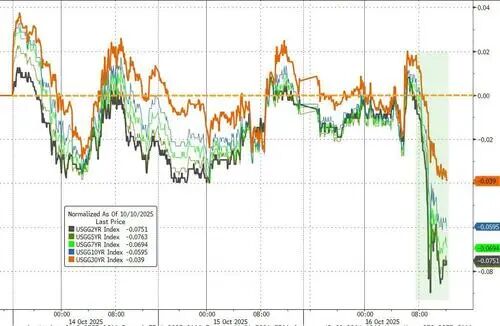 随着信贷担忧推动避险需求,美国国债价格在隔夜全线飙升,两年期国债收益率跌至了2022年9月以来的最低水平,10年期美债收益率则进一步跌破了4%关口,尾盘下跌6.9个基点至3.976%,刷新了4月“解放日”关税以来的新低。