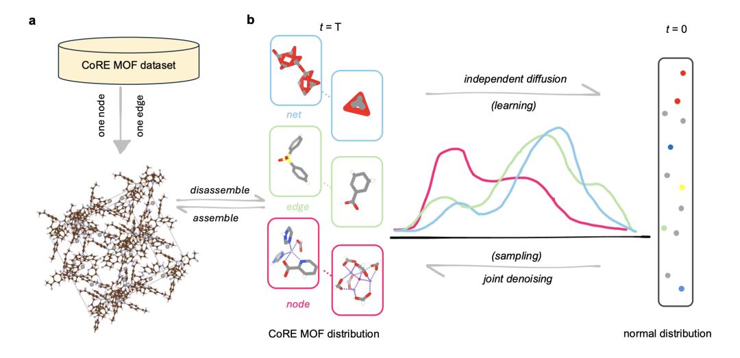 * 从随机噪声中采样,逐步去噪并恢复节点与配体的位置,基于PORMAKE 工具将这些构件重新组装,生成完整的 MOF 三维结构。