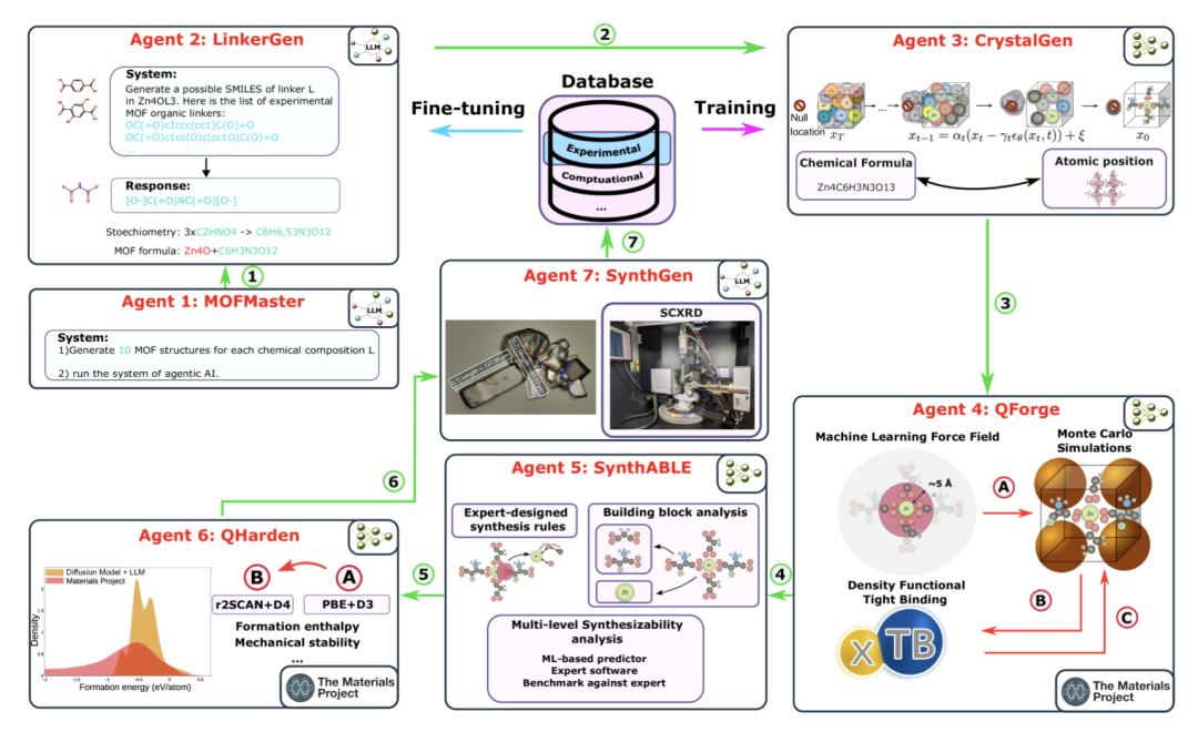 2025 年 4 月,Omar Yaghi 与加州大学伯克利分校的其他研究人员则推出了集成 LLM、扩散模型(diffusion)、量子力学代理、合成可行性预测器等模块的 Agentic AI 系统「MOFGen」,用于从头生成 MOF 结构,并对结构进行筛选验证。MOFGen 工作流程分为 7 个步骤:
