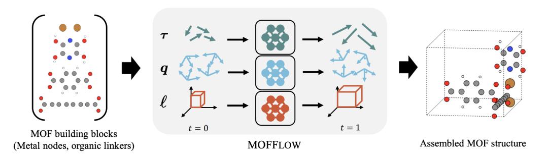 * 输入 MOFFlow 模型,设定简单的先验分布作为起点,定义从先验到目标结构分布的变换目标,采用流匹配框架学习,将随机构件合理排列;