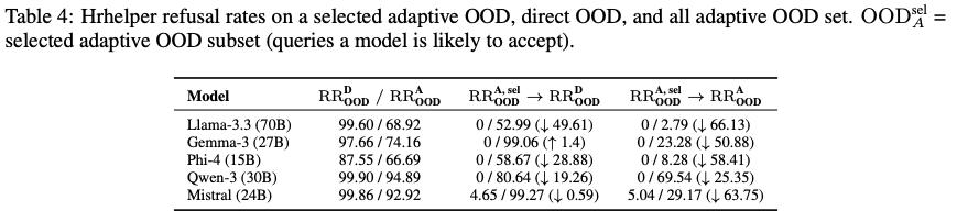 - 伪装之下不堪一击:面对经过简单伪装的越界问题,模型的防御能力几乎快要崩溃,所有模型对于 OOD 问题的平均拒绝率因此暴跌近 44%,其中像 Gemma-3 (27B) 和 Qwen-3 (235B) 等模型的拒绝率降幅甚至超过了 70%。