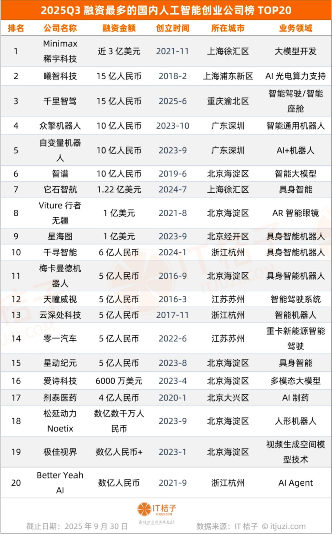 据IT桔子统计,2025Q3前十名人工智能企业合计狂揽超百亿元!